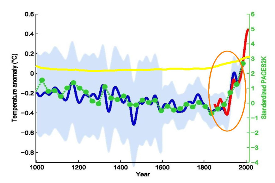 Das Hockey-Stick Diagramm liess mit geschickt gewählten Massstäben die Mittelalterliche Warmzeit von 900 bis 1200 kaum erkennen. (Ohne eine eingetragene Kurve des CO2-Anteils konnte man auch nicht sehen, dass CO2 unmöglich die Erwärmung steuern konnte.)