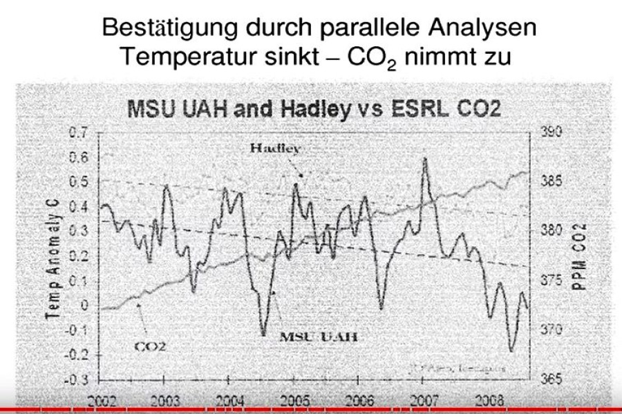 Dieses Diagramm wäre die einfachste Darstellung zur Wirksamkeit des CO2. Es stellt sich die Frage: Weshalb wurde es vermieden, weshalb wurde es nie gezeigt? Es ist CO2-klar: Man hätte sofort gesehen, dass CO2 nicht wirksam ist.